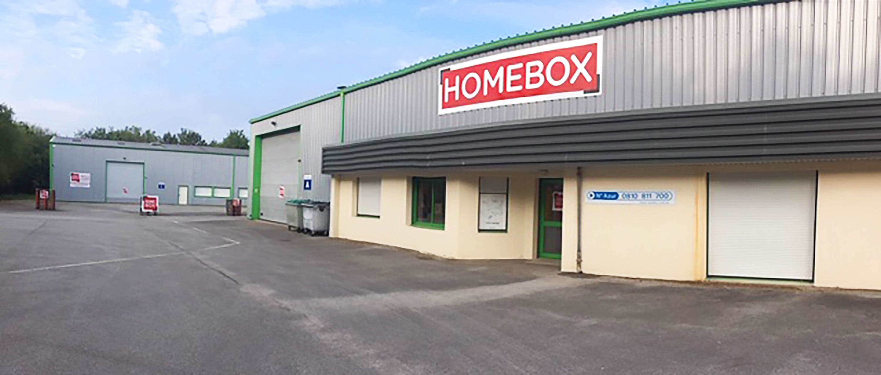 Vue latérale du bâtiment principal du centre HOMEBOX Auray avec portes et enseignes.